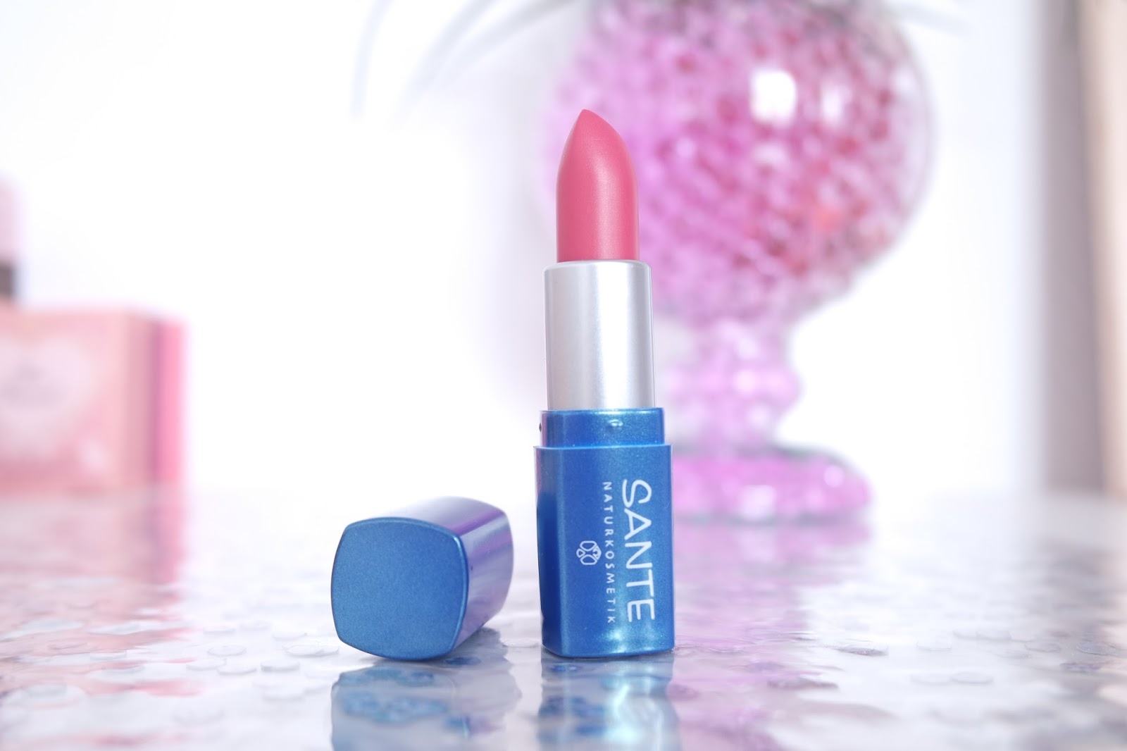 Pour l’heure, j’ai choisi de te présenter le rouge à lèvre n°21 de Santé NaturKosmetik ! C’est une marque bio que je trouve généralement dans les biocoops, elle propose divers produits aux teintes assez claires et similaires avec un packaging assez sobre. Bref, ce dernier ne déroge pas à la règle, je l’ai reçu pour Noël et je me suis demandée au début si j’allais vraiment l’apprécier… On commence par l’emballage qui est bleu irisé où on retrouve le nom de la marque en blanc. Ça change des packagings girly pour lesquels je craque habituellement, mais je le trouve joli quand même.