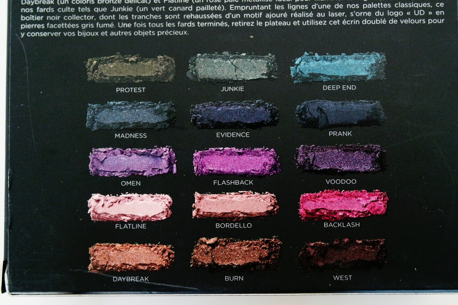 De base, c’est une palette assez sobre, carrée et noire, matte. J’ai été surprise par la taille car je la voyais plus grande… Sinon, on retrouve les initiales de la marque en violet foncé en relief au milieu du couvercle, ainsi que le nom de la palette. En l’ouvrant, on découvre que le fond du couvercle est un miroir. Le socle contenant les fards est brillant, moins foncé que le couvercle, miroitant… En bref, on retrouve bien l’ADN d’Urban Decay, sombre, voire un peu gothique, mystérieux. Un emballage simple mais efficace, en contraste avec les fards, que je vais te présenter maintenant !