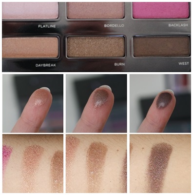La palette est composée de 15 fards, satinés, irisés et pailletés, allant du vert au doré, passant par le bleu, le violet et le rose.Ces trois fards sont bien pigmentés, bien que le premier un peu moins. Hormis cela, ils font peu de chutes et s’appliquent bien.